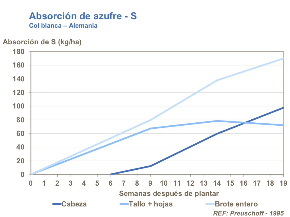 Azufre es un componente importante en enzimas y proteínas, y es importante para la formación de clorofila. Un suministro constante de azufre es necesario durante toda la temporada. No obstante, es importante que coincidan los suministros de azufre y nitrógeno. Un incremento de nitrógeno puede restringir la absorción de azufre. Puede ser un efecto de dilución por desarrollo más vigoroso, o una competencia directa en la absorción.