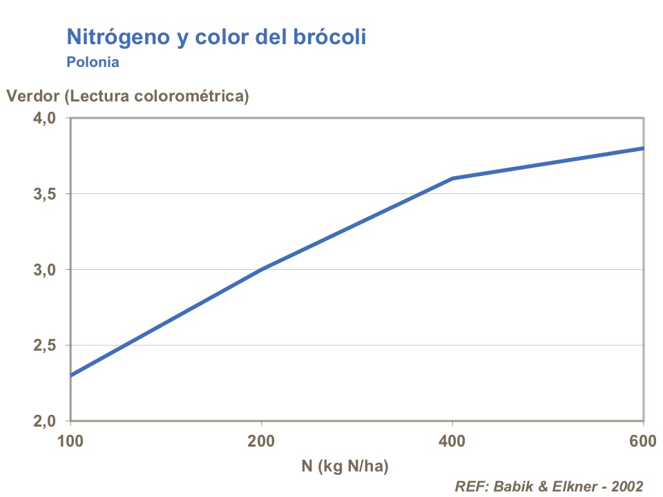 Una fertilización nitrogenada tambien mejora el color del cultivo y reduce la incidencia de cabeza marrón en brócoli, así mejorando la comerciabilidad.