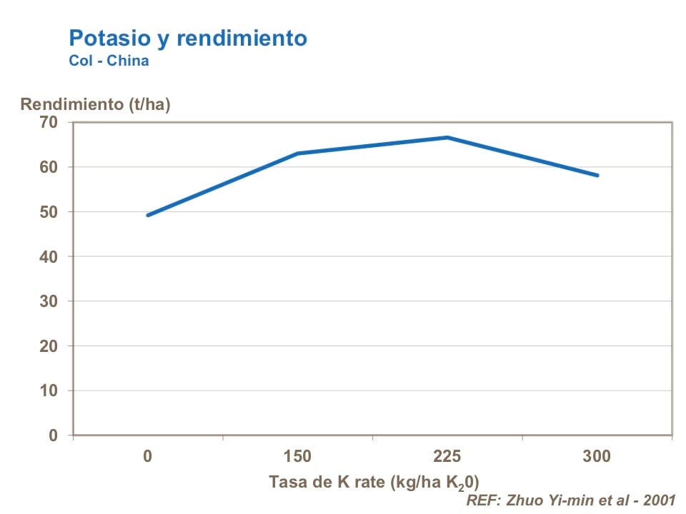El potasio fomenta la producción de biomasa en la planta y por eso también el tamaño y peso de la cabeza. Los suministros tienen que ser equilibrados con los de nitrógeno. El potasio también ayuda en reducir la variabilidad en la maduración al cosechar y en mantener la compacidad de las cabezas.