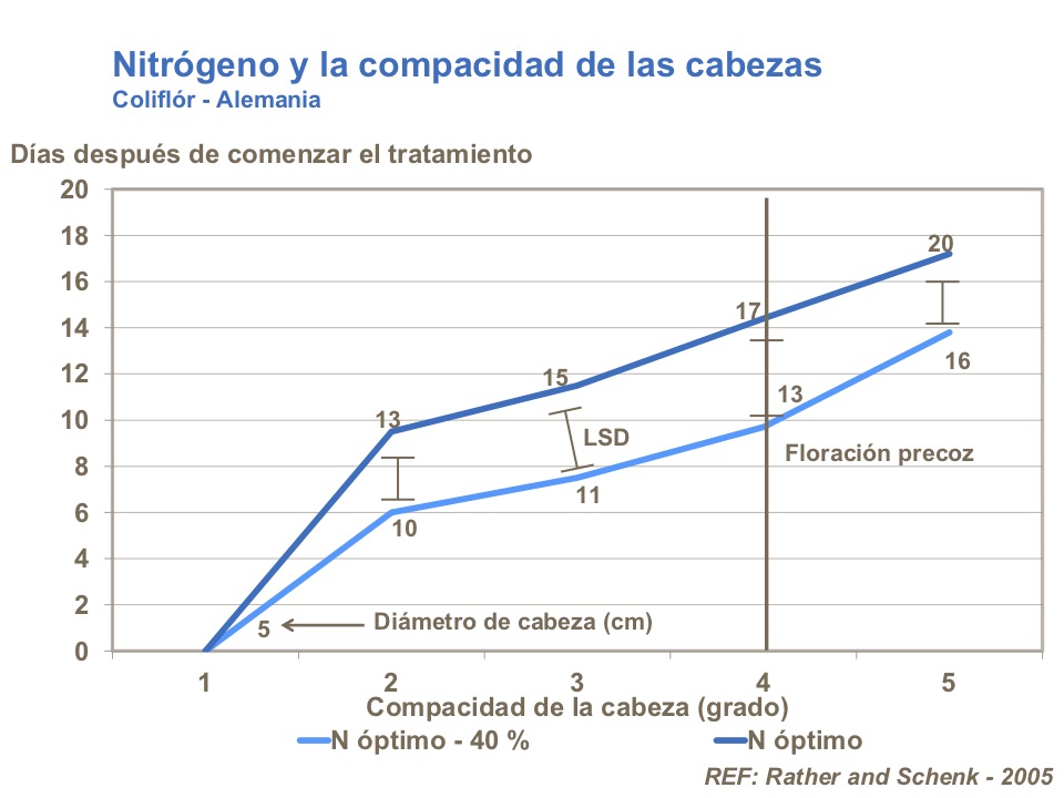 Nitrógeno estimula el desarrollo de brassicas y un la planta requiere un buen suministro para las hojas que cubren la cabeza para que provean lo suficiente de fotosintatos y nutrientes a la cabeza. Buena relación entre hojas y cabeza solo puede lograrse aplicando cantidades óptimas de nitrógeno.