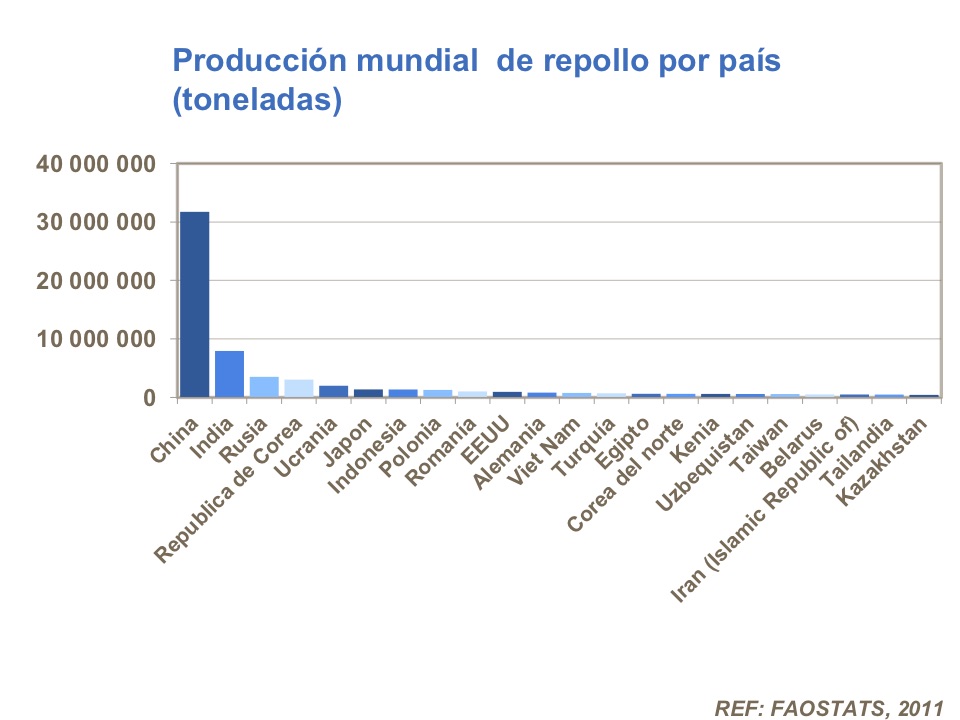 El mayor productor de repollo es China, con aproximadamente 50% de la producción mundial. India, Rusia y Corea producen todos más de 3 millones de toneladas y les siguen Ucrania, Japón e Indonesia.