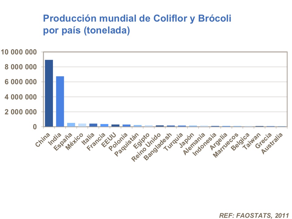 Se producen 20 millones de toneladas de brócoli y coliflor en el mundo, sobre una superficie de 1.6 millones de hectáreas. China y la India son los principales productores con 8.9 y 6.7 millones de toneladas por año, respectivamente, y representa 74% de la producción mundial. Les siguen España, México, Italia, Francia, EEUU, Polonia, Paquistán y Egipto, todos produciendo más de 0.2 millones toneladas/año.