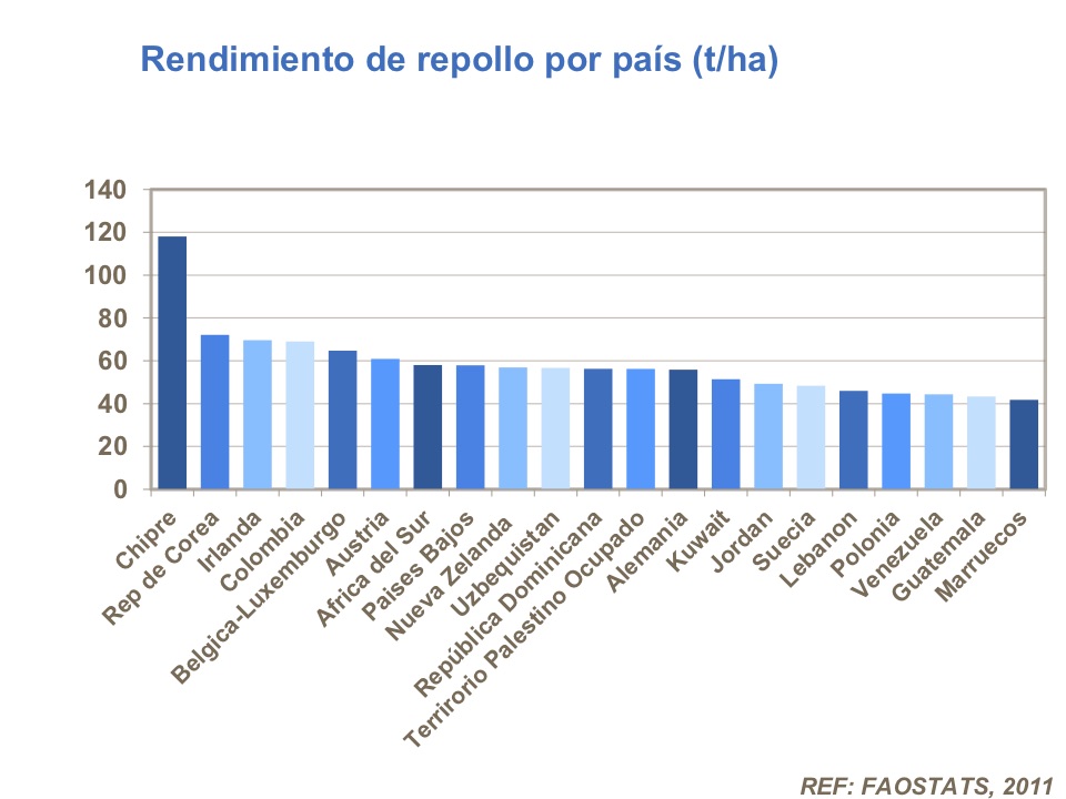 Se producen aproximadamente 70 millones de toneladas de repollo por año a nivel mundial, sobre una superficie de 3.8 millones de hectáreas en casi 150 países. La producción de repollo es más de cuatro veces la de coliflor y brócoli., como resultado de una creciente demanda en la población y dietas cambiantes, la producción de repollo ha tenido un incremento de 20% durante los cinco años entre 2000 y 2005.