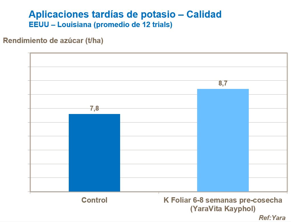 En ensayos con aplicaciones de potasio foliar 6 a 8 semanas antes de la zafra, los investigadores reportaron un incremento de 15,1% en °Brix, y 20% en Pol y una reducción en contenido de fibra de 28%. También es importante tener suficiente potasio disponible para poder usar el nitrógeno asimilado en la caña para tener una buena maduración del cultivo y asegurar que los azúcares reductores se conviertan a sacarosa.