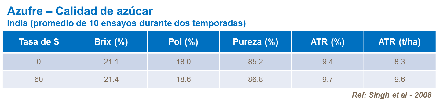 Ensayos confirman que azufre tiene un efecto en una variedad de características que influyen en la calidad de azúcar incluyendo Brix, Pol, pureza del jugo y ATR.