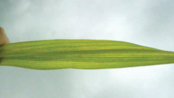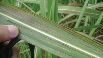 Deficiencia de manganeso en caña de azúcar tiene síntomas similares con bandas cloróticas longitudinales entre las venas, y se ven primero en hojas jóvenes. Estás bandas suelen empezar desde la mitad de la hoja y llegar hasta la punta. Las láminas de las hojas pueden partirse o hacerse tiras sólo con el viento y, con deficiencias severas, toda la hoja se blanquea.
