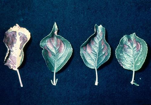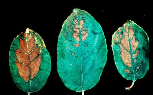Los síntomas aparecen primero como clorosis entre los nervios principales de las hojas más viejas. Después evolucionan a necrosis entre los nervios o parches necróticos a lo largo del nervio principal. A menudo el margen de las hojas permanece verde.