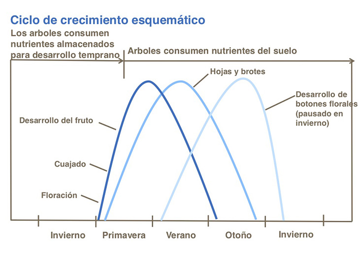 Una proporción significante de nitrógeno se consume temprano en la temporada para sostener buen desarrollo vegetal, floración y cuajado. Nitrógeno en exceso aplicado más tarde, puede tener efectos adversos en la calidad del fruto. Como resultado, es una práctica común aplicar nitrógeno en dos fases de desarrollo. Primero en el otoño terminando la cosecha, para impulsar buenas reservas en el árbol para su nueva movilización posterior para apoyar floración, cuajado y desarrollo foliar temprano en primavera. La segunda aplicación se hace cuando los árboles florean, para asegurar desarrollo de frutos y follaje más tarde en la primavera y en verano.