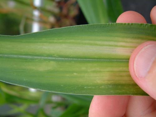 La hoja tiene apariencia listada con clorosis que van en paralelo a la nervadura empezando por la base de la hoja.