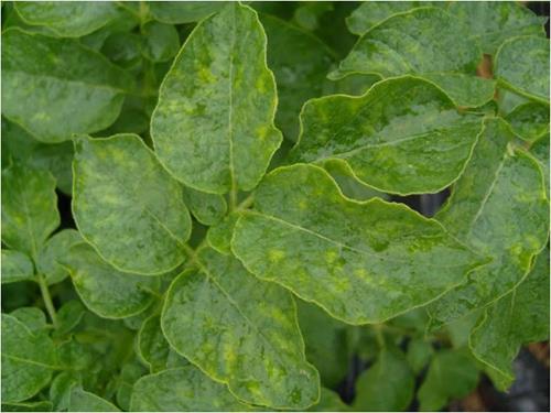 Los síntomas comienzan con un moteado amarillo en los costados de la hoja, a menudo en la base do los foliolos o el margen de la hoja. La clorosis se extiende a toda la superficie foliar si la deficiencia continua.