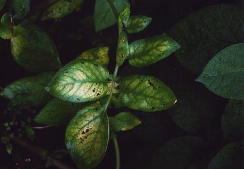 La deficiencia de manganeso es parecida, aunque en ésta el amarillamiento intercostal comienza en las hojas más jóvenes y la necrosis se forma normalmente en manchas a lo largo de la línea de las nervaduras.
