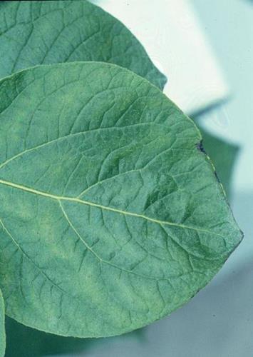 Los síntomas comienzan en las hojas más jóvenes. Las nervaduras de las hojas se mantienen verdes, aunque se desarrollan manchas negras a lo largo de la línea de las nervaduras. Los foliolos se curvan hacia arriba completamente. Las hojas cerca del ápice del tallo son pequeñas y cloróticas/ necróticas.
