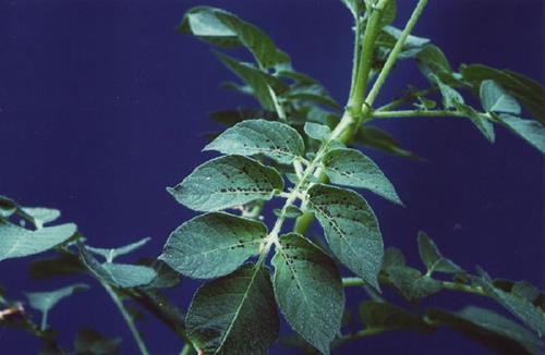 Los síntomas comienzan por las hojas más jóvenes, las hojas se vuelven verde pálido / amarillo y después desarrollan manchas negras a lo largo de la línea de las nervaduras.