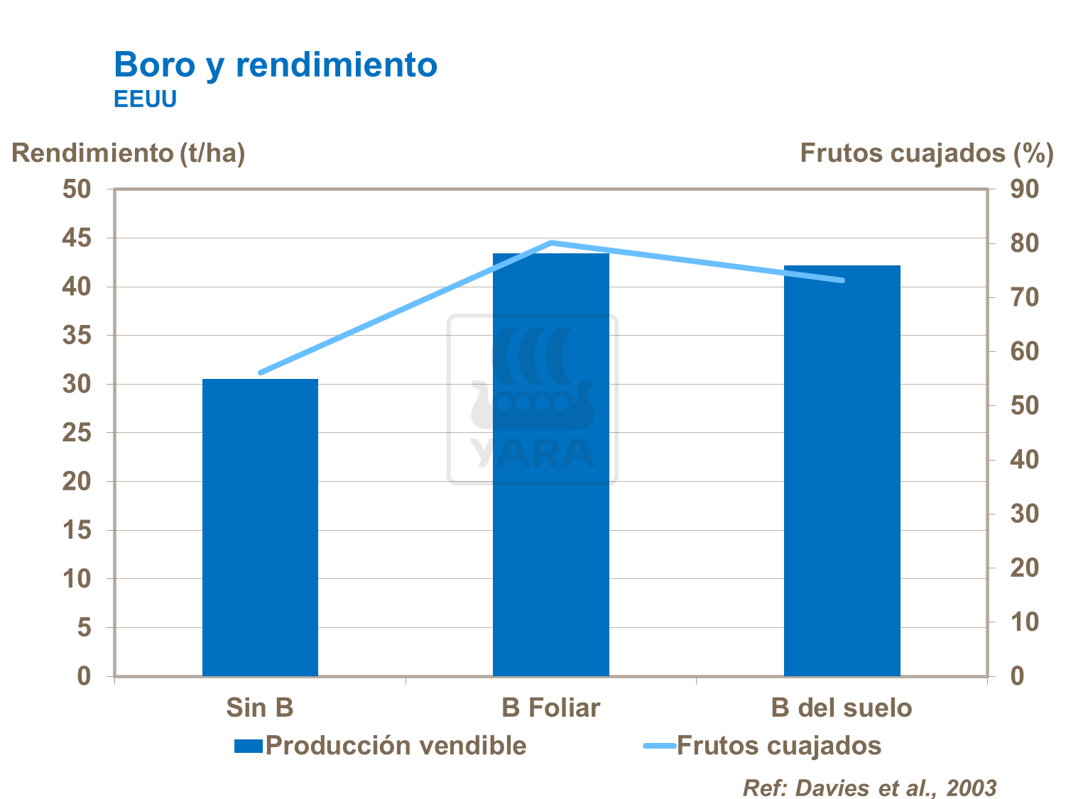 La nutrición de boro no sólo incrementa la producción por número de frutos, si no también por mejorar su peso.