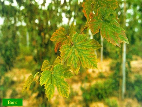 Los síntomas de la deficiencia de boro en las hojas aparecen primero como clorosis en los bordes. La clorosis se extiende entre las nervios. Posteriormente, los bordes de las hojas presentan un color marrón rojizo y mueren. Los nervios principales cercanos suelen mantener el color verde.